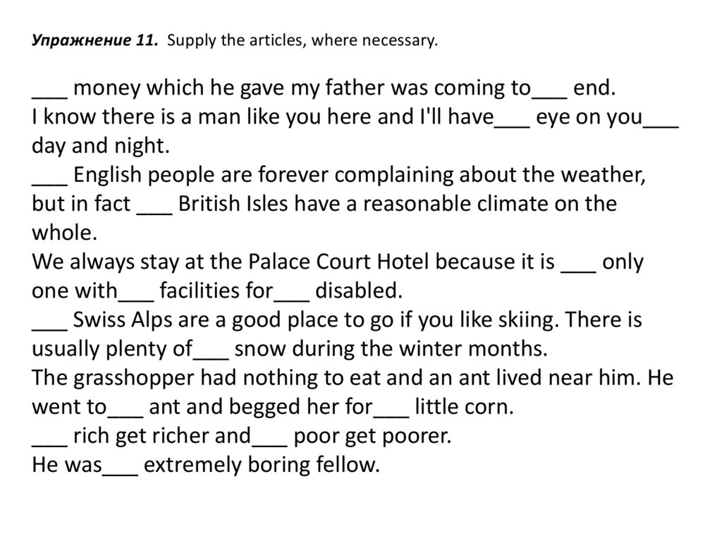 Упражнение 11. Supply the articles, where necessary.___ money which he gave my father was coming to___ end.
