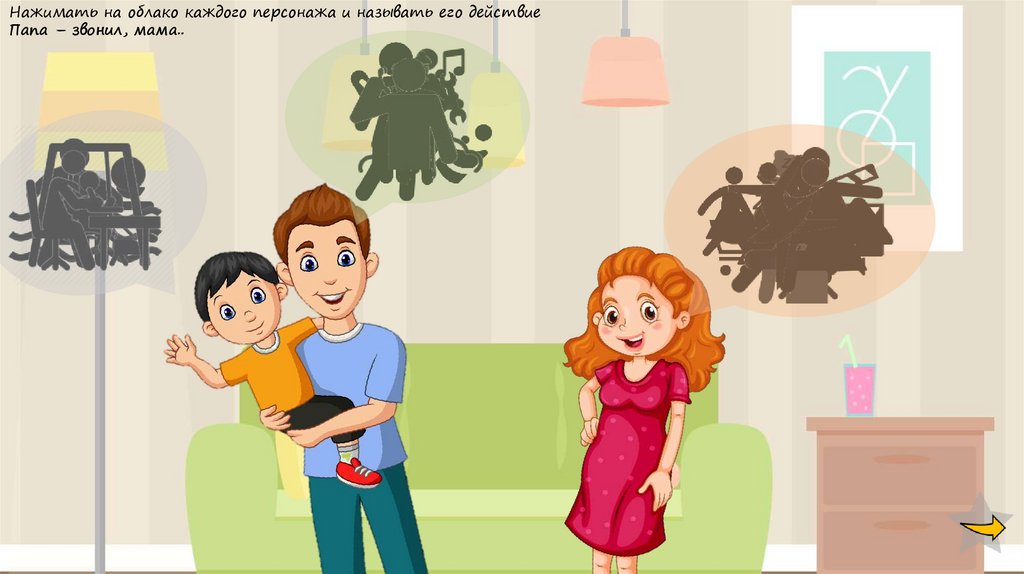 Нажимать на облако каждого персонажа и называть его действие