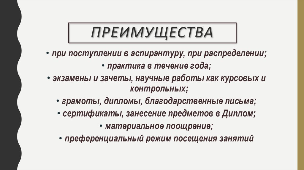 ПРЕИМУЩЕСТВА• при поступлении в аспирантуру, при распределении;