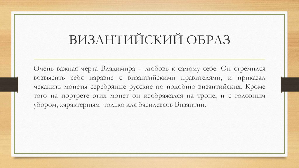 ВИЗАНТИЙСКИЙ ОБРАЗОчень важная черта Владимира – любовь к самому себе. Он стремился