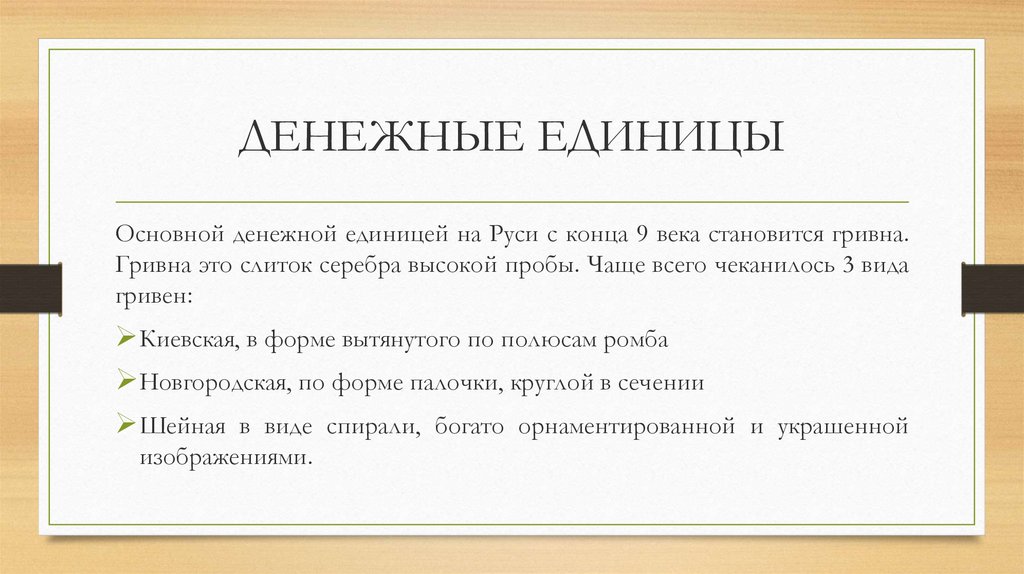 ДЕНЕЖНЫЕ ЕДИНИЦЫОсновной денежной единицей на Руси с конца 9 века становится гривна.