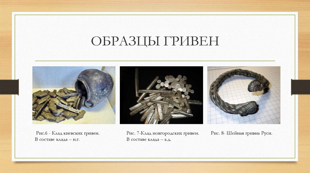 Гривна это слиток серебра высокой пробы. Чаще всего чеканилось 3 вида