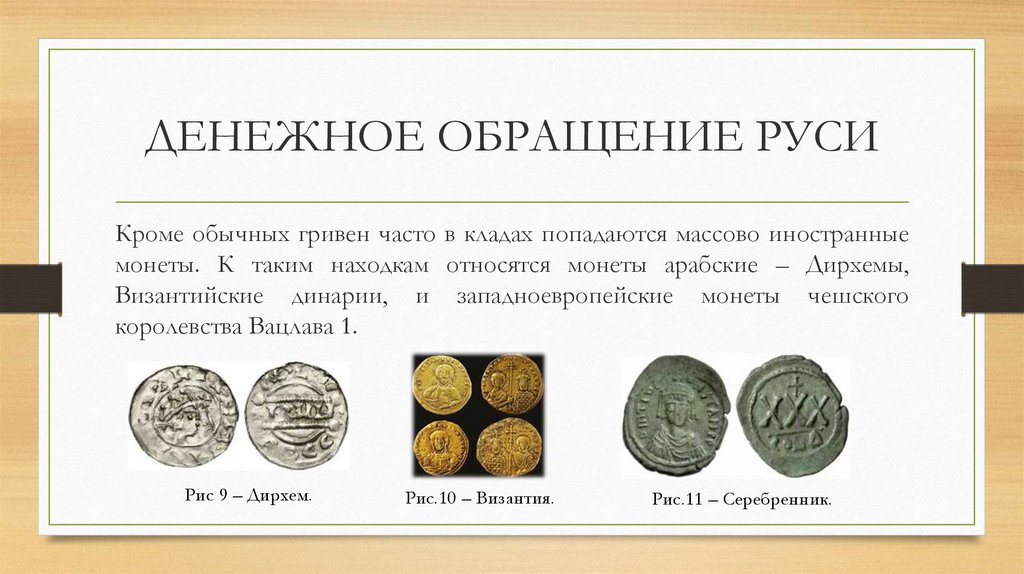 ДЕНЕЖНОЕ ОБРАЩЕНИЕ РУСИКроме обычных гривен часто в кладах попадаются массово иностранные