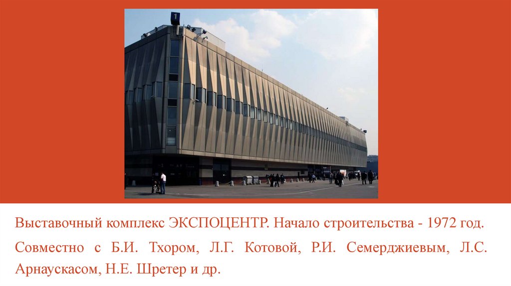 Выставочный комплекс ЭКСПОЦЕНТР. Начало строительства - 1972 год.Совместно с Б.И. Тхором, Л.Г. Котовой, Р.И. Семерджиевым, Л.С.