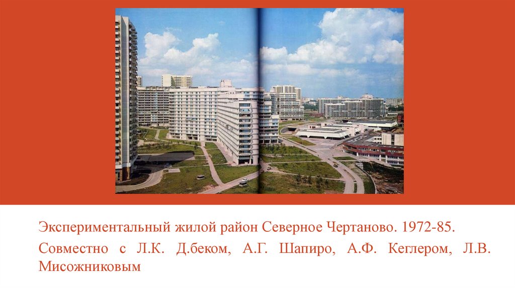 Экспериментальный жилой район Северное Чертаново. 1972-85.Совместно с Л.К. Д.беком, А.Г. Шапиро, А.Ф. Кеглером, Л.В.