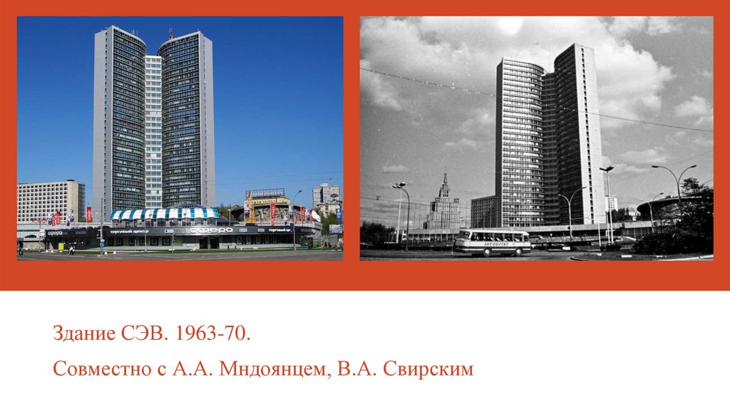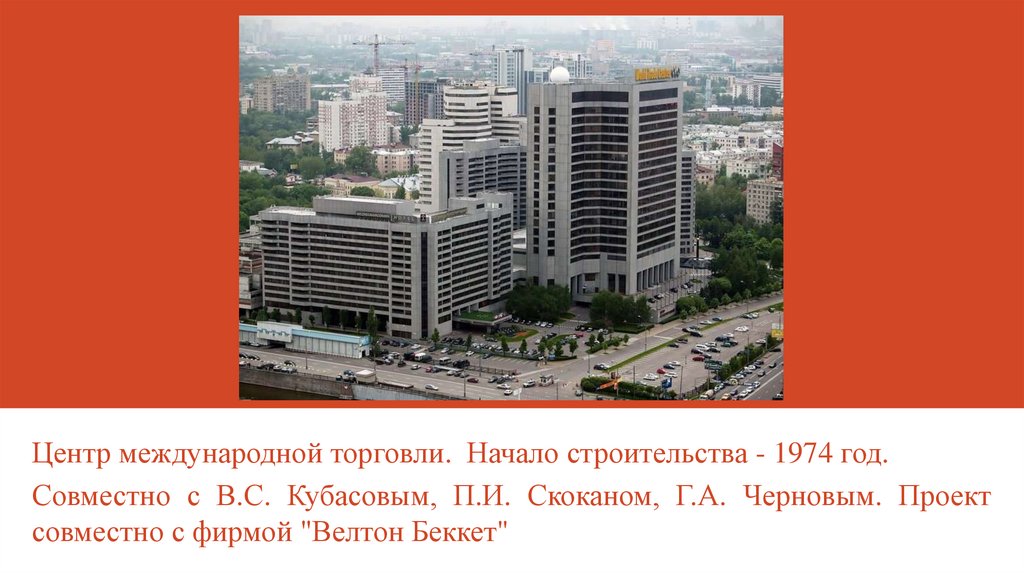 Центр международной торговли. Начало строительства - 1974 год.Совместно с В.С. Кубасовым, П.И. Скоканом, Г.А. Черновым. Проект