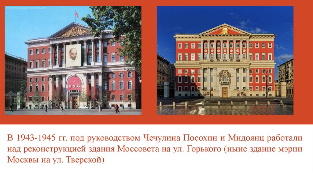 В 1943-1945 гг. под руководством Чечулина Посохин и Мндоянц работалинад реконструкцией здания Моссовета на ул. Горького (ныне здание мэрии