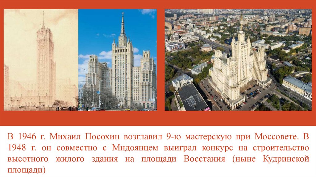 В 1946 г. Михаил Посохин возглавил 9-ю мастерскую при Моссовете. В1948 г. он совместно с Мндоянцем выиграл конкурс на строительство