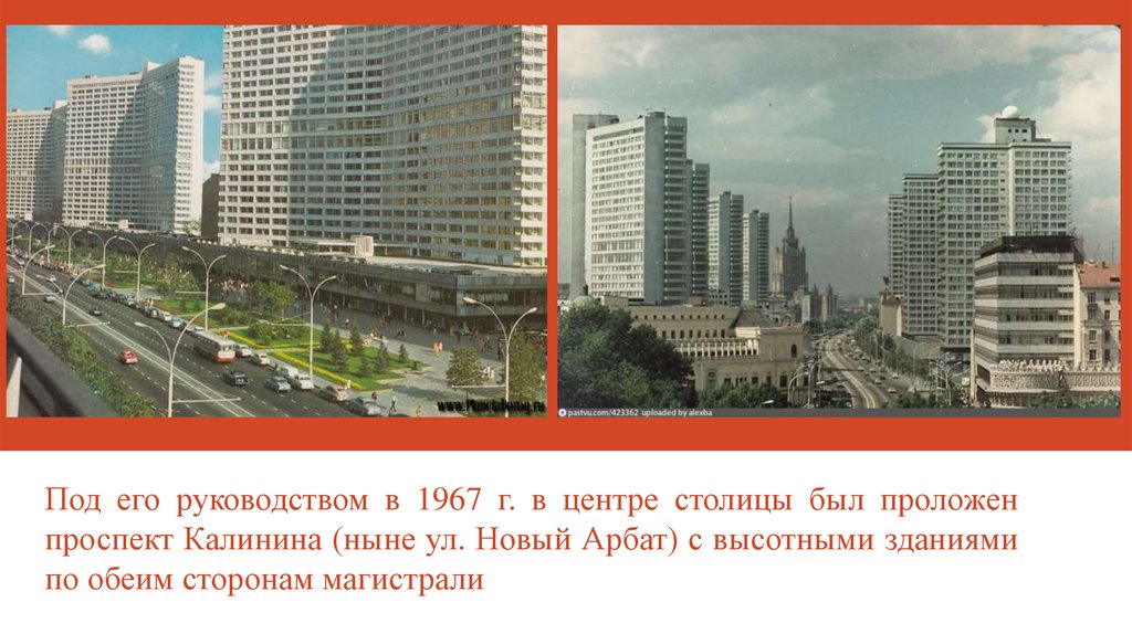 Под его руководством в 1967 г. в центре столицы был проложенпроспект Калинина (ныне ул. Новый Арбат) с высотными зданиями