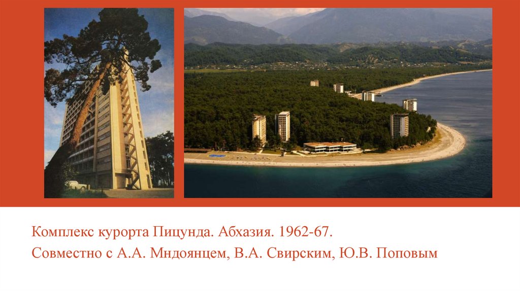 Комплекс курорта Пицунда. Абхазия. 1962-67.Совместно с А.А. Мндоянцем, В.А. Свирским, Ю.В. Поповым