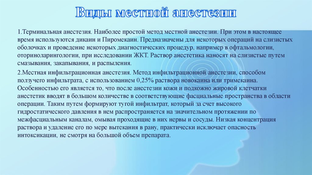 1.Терминальная анестезия. Наиболее простой метод местной анестезии. При этом в настоящеевремя используются дикаин и Пиромекаин. Предназначены для некоторых операций на слизистых
