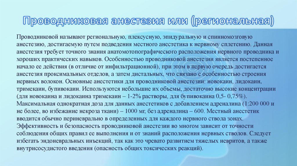 Проводниковой называют региональную, плексусную, эпидуральную и спинномозговуюанестезию, достигаемую путем подведения местного анестетика к нервному сплетению. Данная