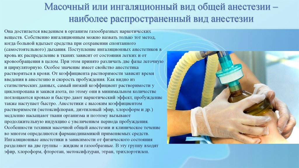 Масочный или ингаляционный вид общей анестезии –наиболее распространенный вид анестезии