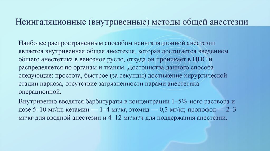 Неингаляционные (внутривенные) методы общей анестезииНаиболее распространенным способом неингаляционной анестезии