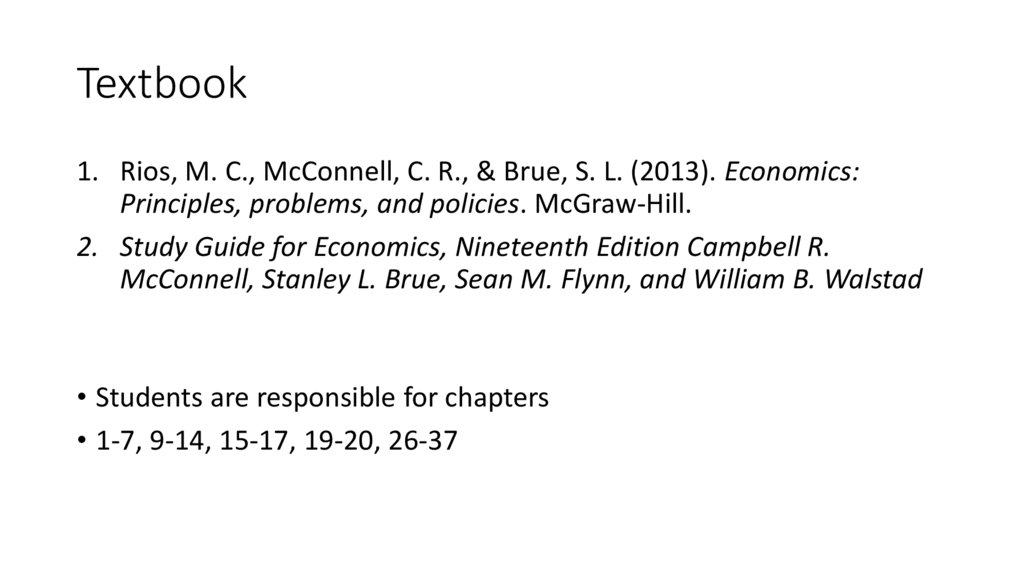 Textbook1. Rios, M. C., McConnell, C. R., & Brue, S. L. (2013). Economics: