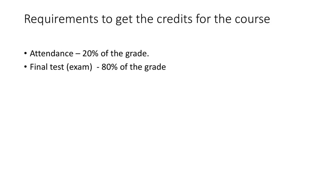 Requirements to get the credits for the course• Attendance – 20% of the grade.