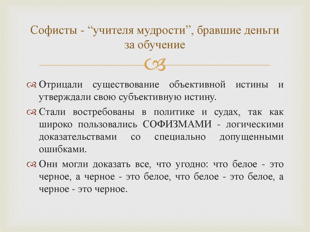 Софисты - “учителя мудрости”, бравшие деньгиза обучение