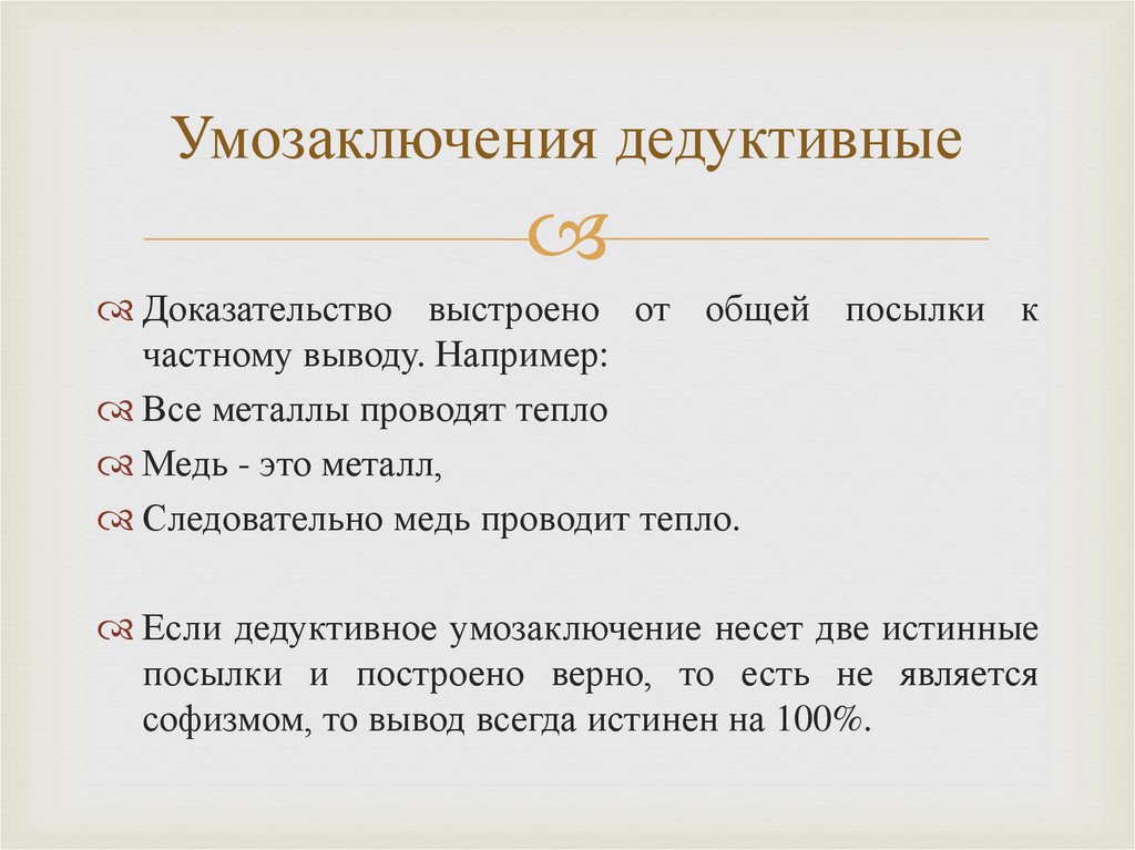 Умозаключения дедуктивныеДоказательство выстроено от общей посылки к