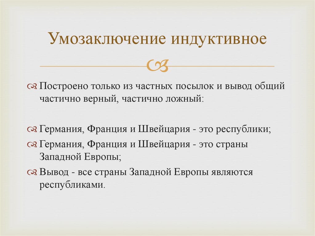 Умозаключение индуктивноеПостроено только из частных посылок и вывод общий
