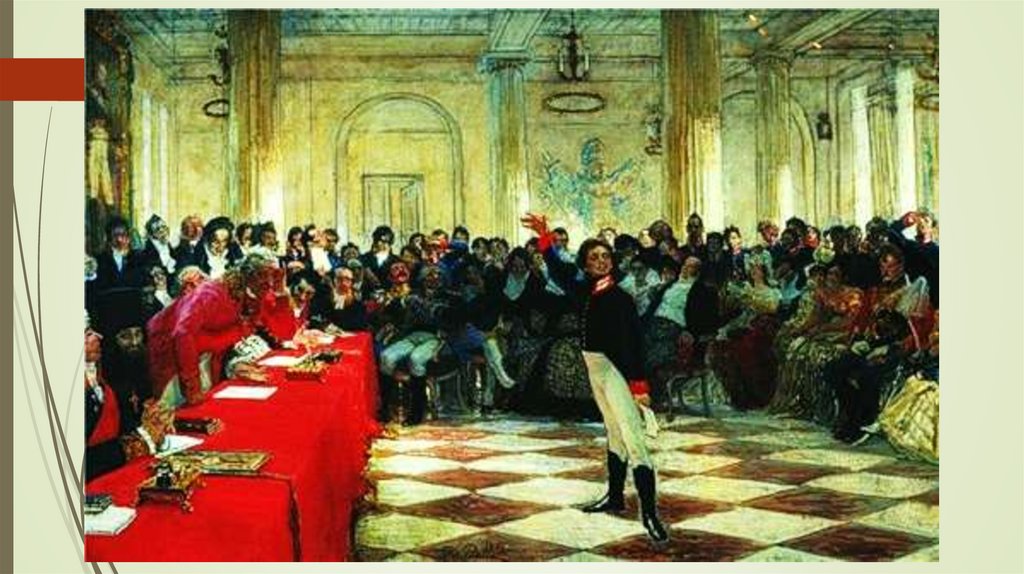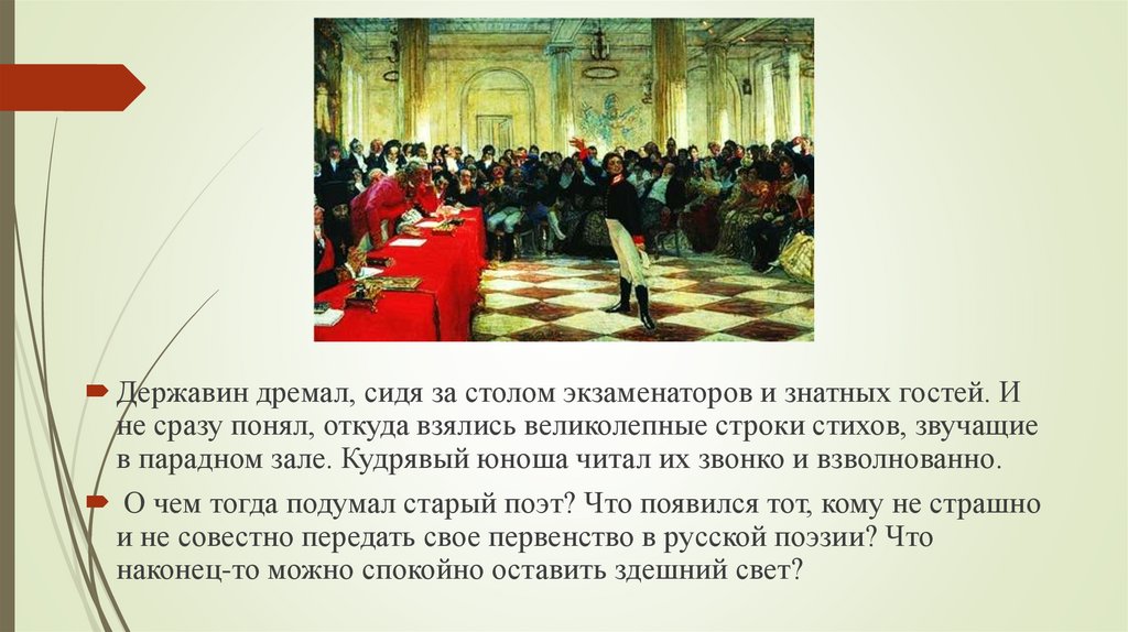 Державин дремал, сидя за столом экзаменаторов и знатных гостей. Ине сразу понял, откуда взялись великолепные строки стихов, звучащие