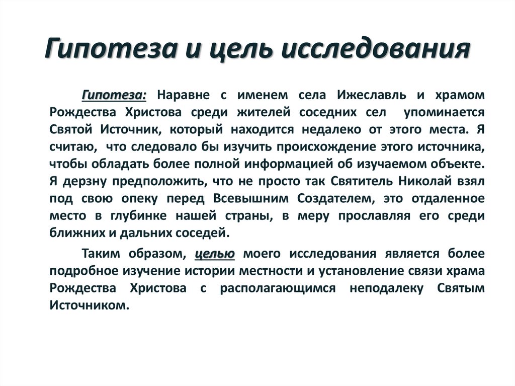 Гипотеза и цель исследованияГипотеза: Наравне с именем села Ижеславль и храмом