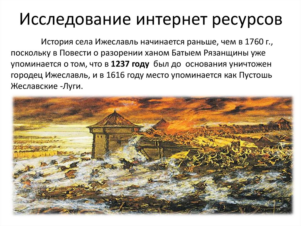Исследование интернет ресурсовИстория села Ижеславль начинается раньше, чем в 1760 г.,