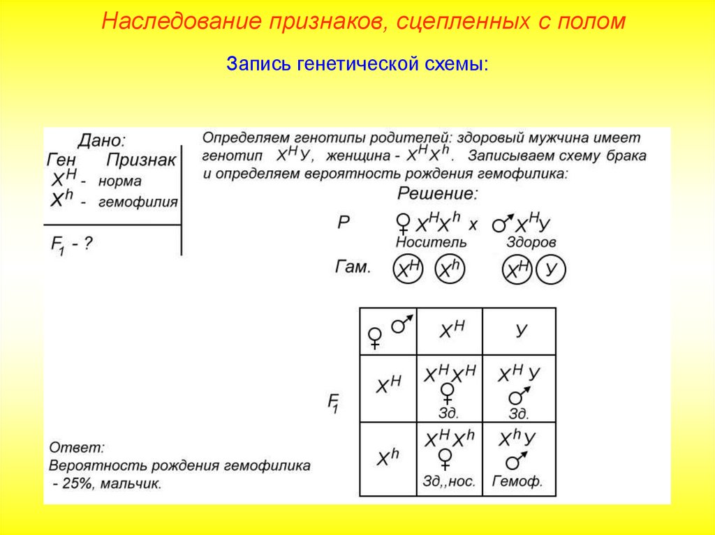 Наследование признаков, сцепленных с поломЗапись генетической схемы:
