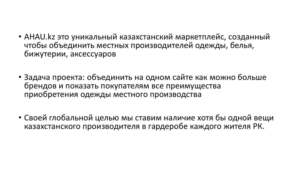 • AHAU.kz это уникальный казахстанский маркетплейс, созданныйчтобы объединить местных производителей одежды, белья,