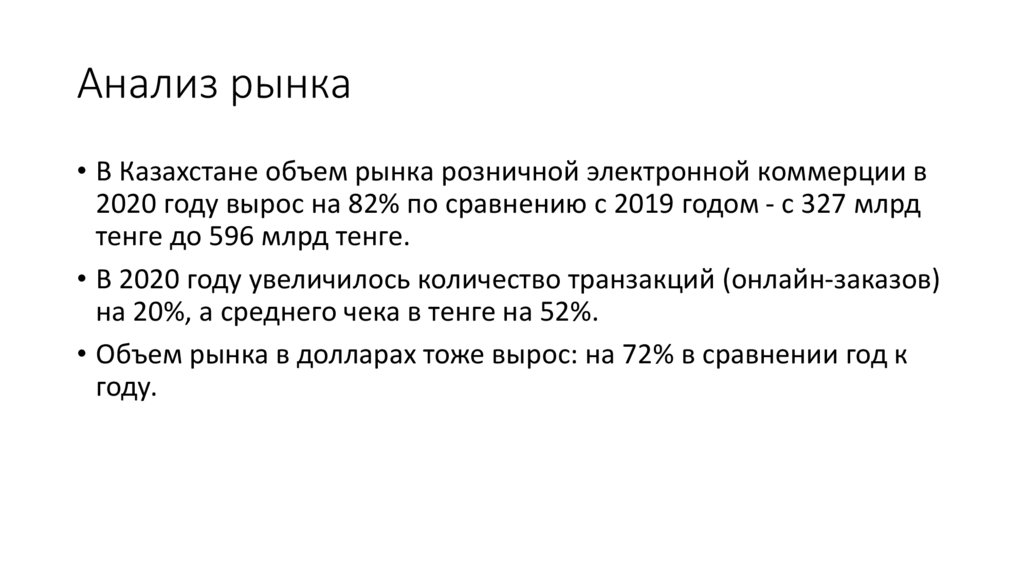 Анализ рынка• В Казахстане объем рынка розничной электронной коммерции в