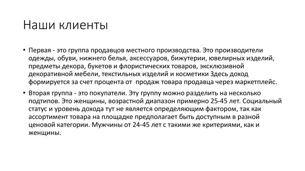 Наши клиенты• Первая - это группа продавцов местного производства. Это производители