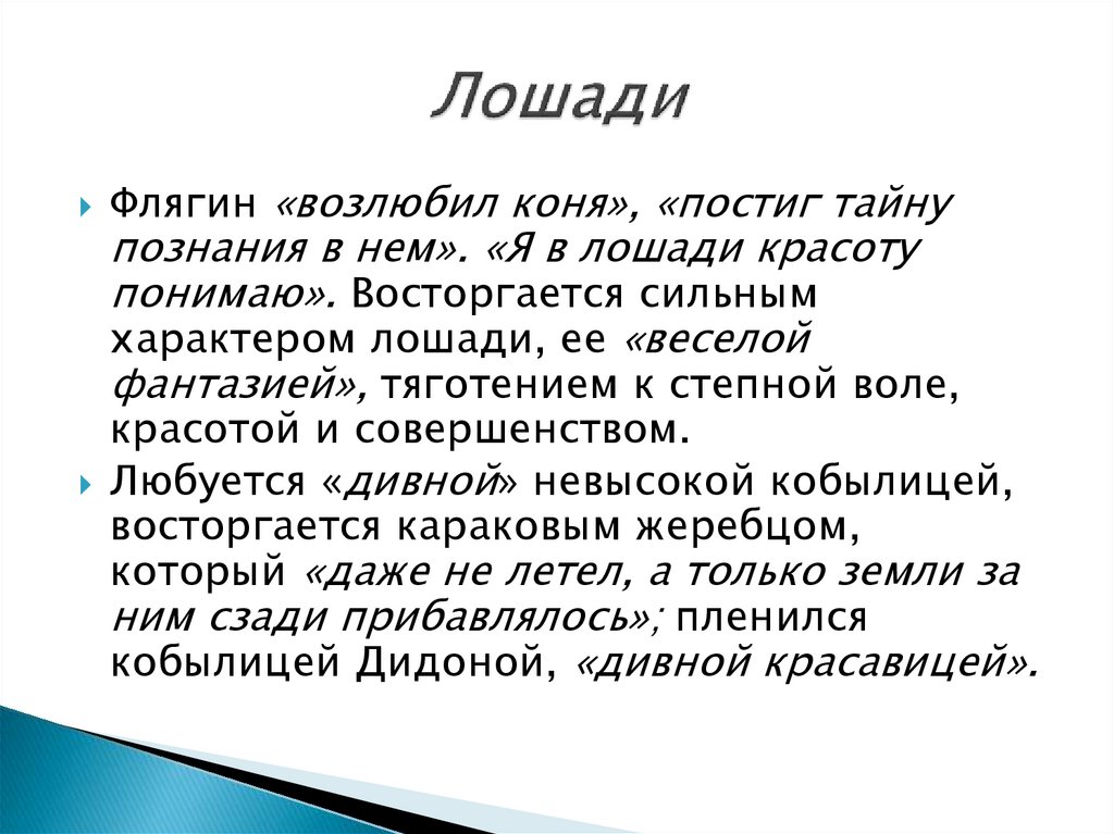 Флягин «возлюбил коня», «постиг тайнупознания в нем». «Я в лошади красоту
