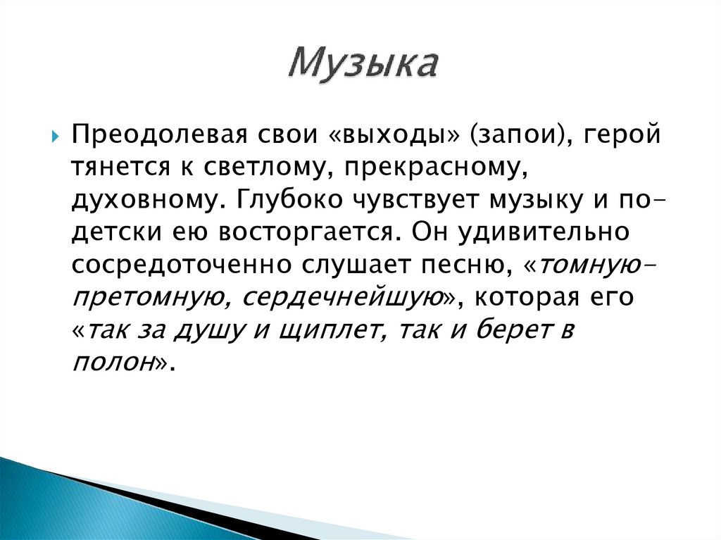 Преодолевая свои «выходы» (запои), геройтянется к светлому, прекрасному,