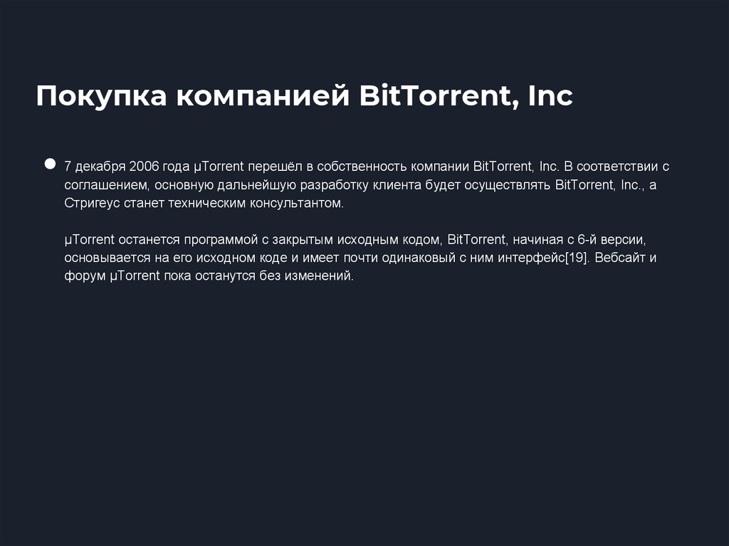 Покупка компанией BitTorrent, Inc● 7 декабря 2006 года μTorrent перешёл в собственность компании BitTorrent, Inc. В соответствии с
