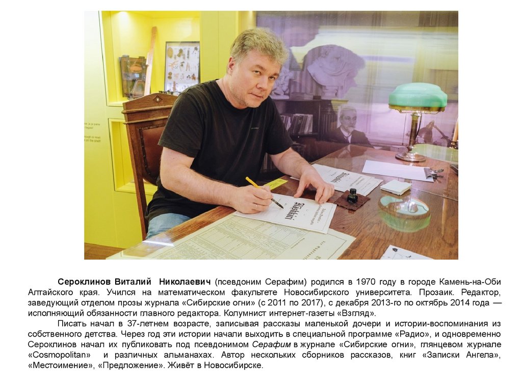 Сероклинов Виталий Николаевич (псевдоним Серафим) родился в 1970 году в городе Камень-на-ОбиАлтайского края. Учился на математическом факультете Новосибирского университета. Прозаик. Редактор,