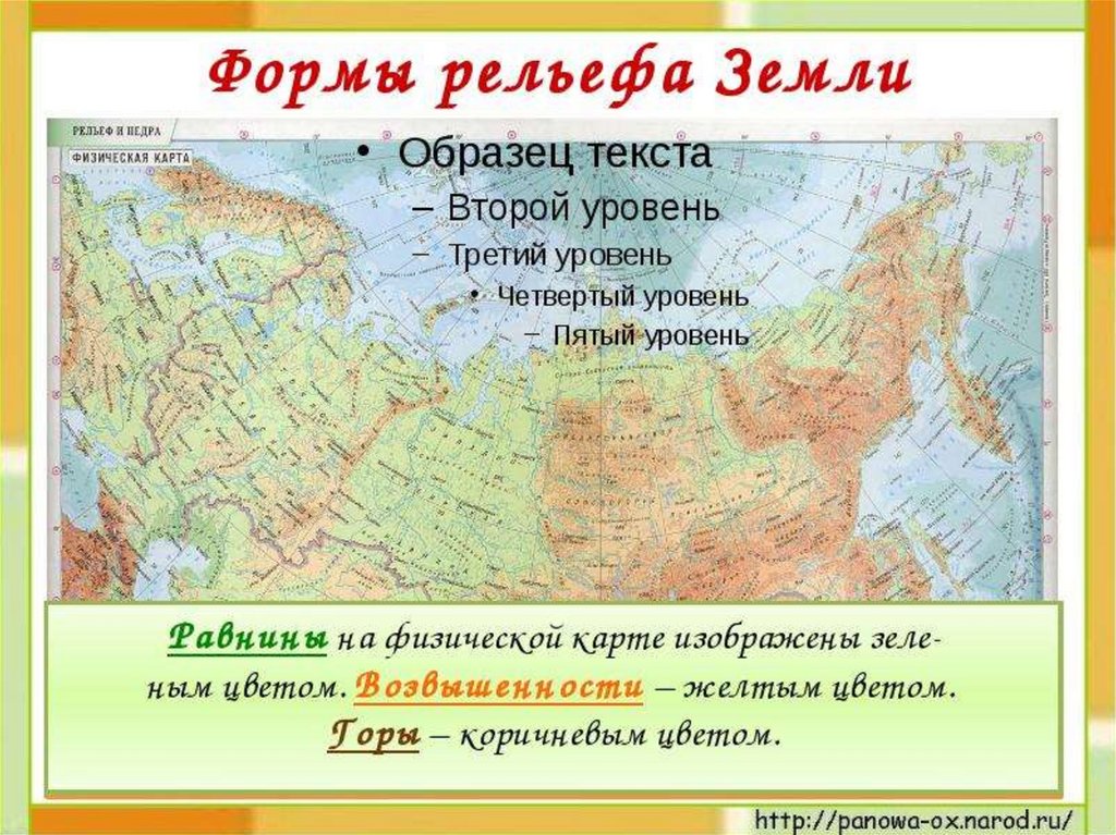 • Равнины-Восточно-Европейская, ЗападноСибирская, Среднесибирское плоскогорье,