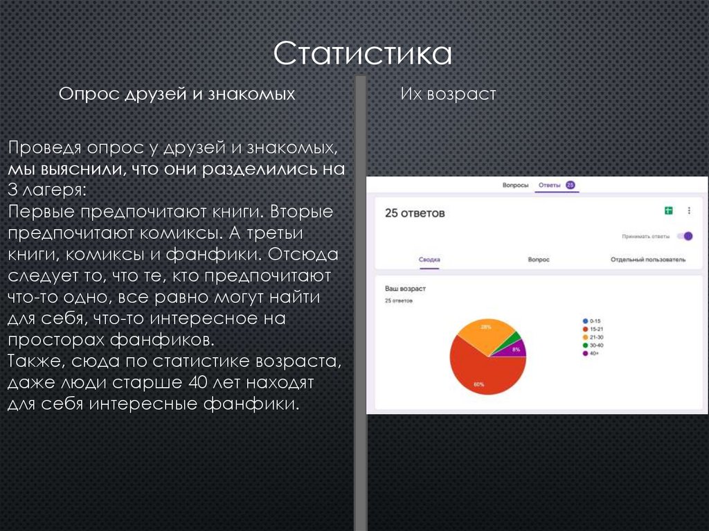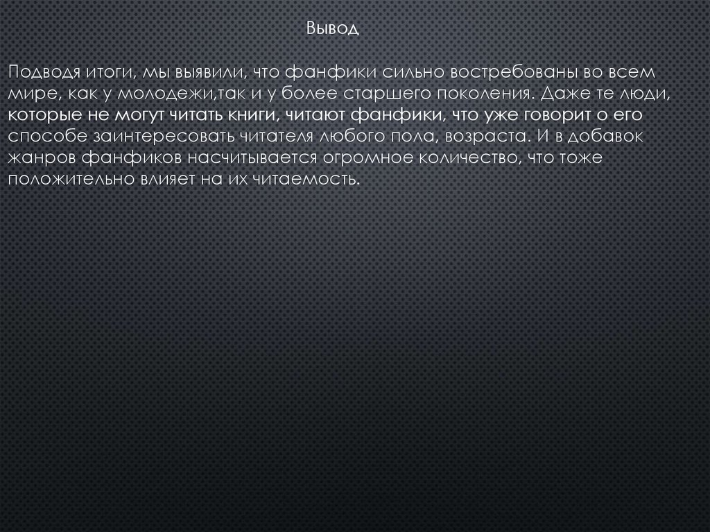 ВыводПодводя итоги, мы выявили, что фанфики сильно востребованы во всем