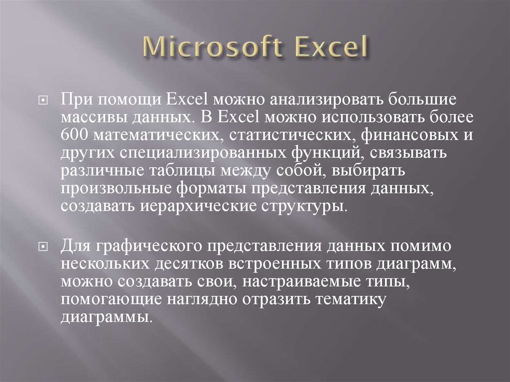 При помощи Excel можно анализировать большиемассивы данных. В Excel можно использовать более