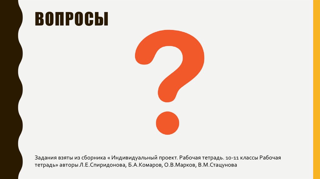 ВОПРОСЫЗадания взяты из сборника « Индивидуальный проект. Рабочая тетрадь. 10-11 классы Рабочая