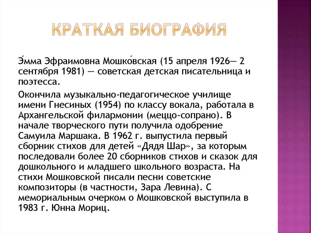 Э́мма Эфраимовна Мошко́вская (15 апреля 1926— 2сентября 1981) — советская детская писательница и