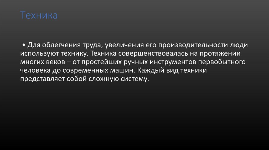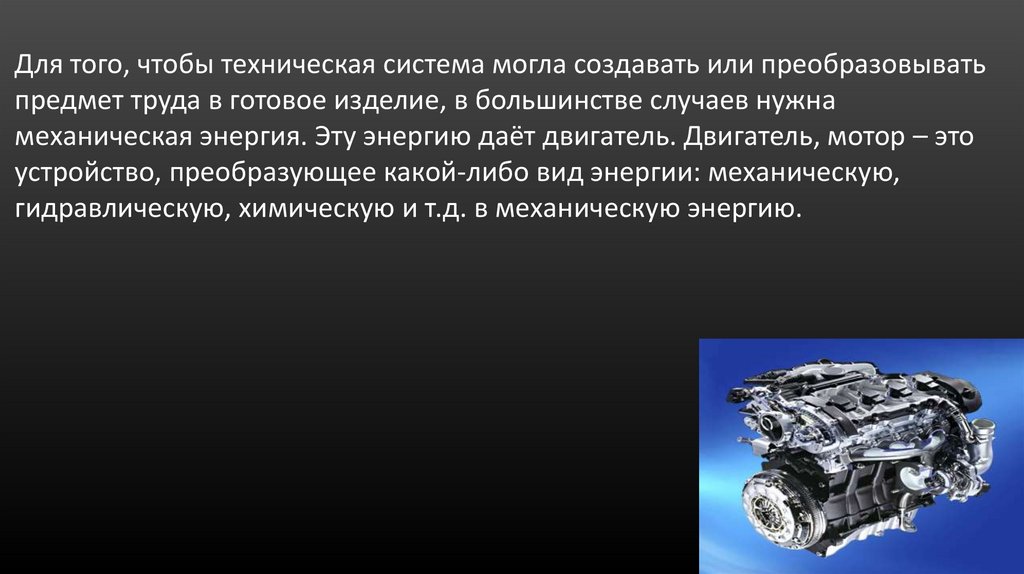Для того, чтобы техническая система могла создавать или преобразовыватьпредмет труда в готовое изделие, в большинстве случаев нужна