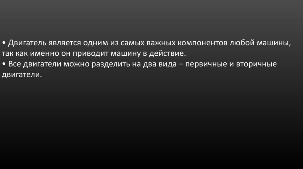 • Двигатель является одним из самых важных компонентов любой машины,так как именно он приводит машину в действие.