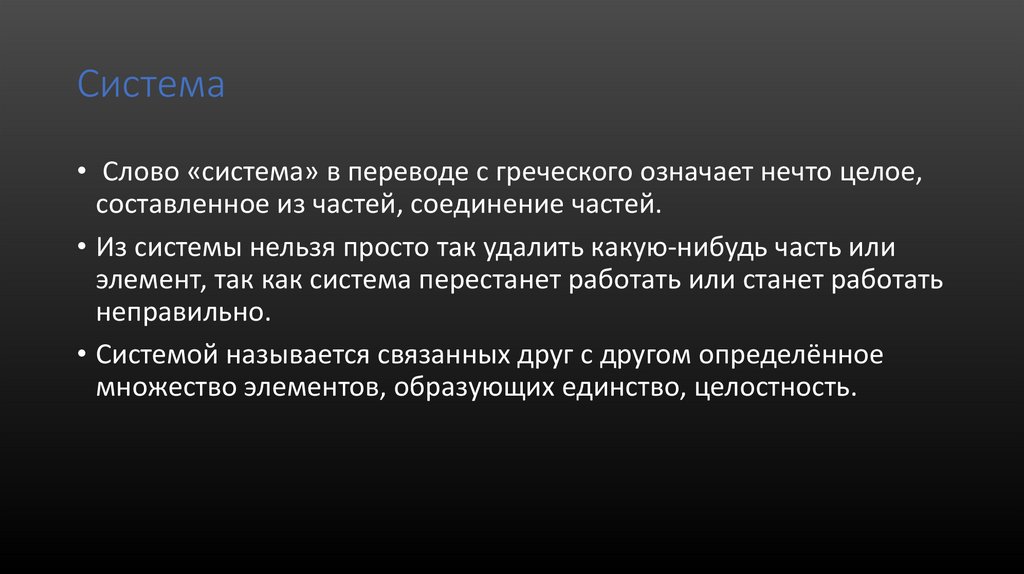 Система• Слово «система» в переводе с греческого означает нечто целое,