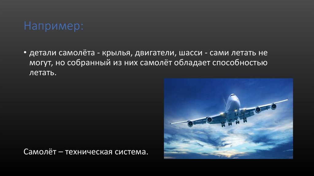 Например:• детали самолёта - крылья, двигатели, шасси - сами летать не