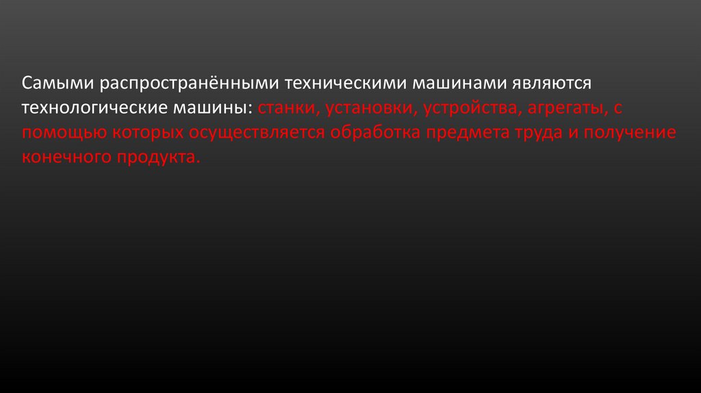 Самыми распространёнными техническими машинами являютсятехнологические машины: станки, установки, устройства, агрегаты, с
