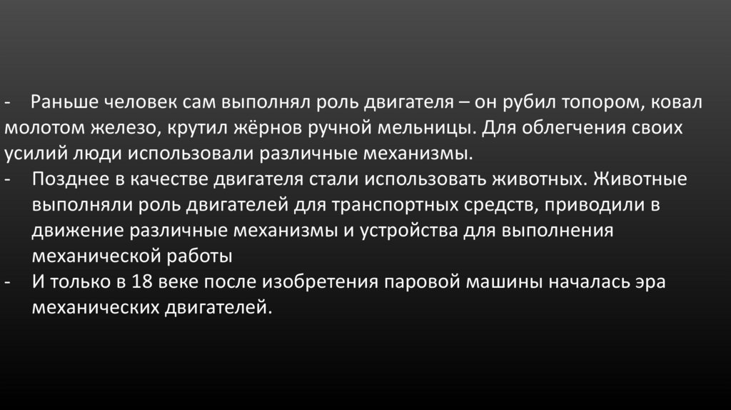 - Раньше человек сам выполнял роль двигателя – он рубил топором, ковалмолотом железо, крутил жёрнов ручной мельницы. Для облегчения своих