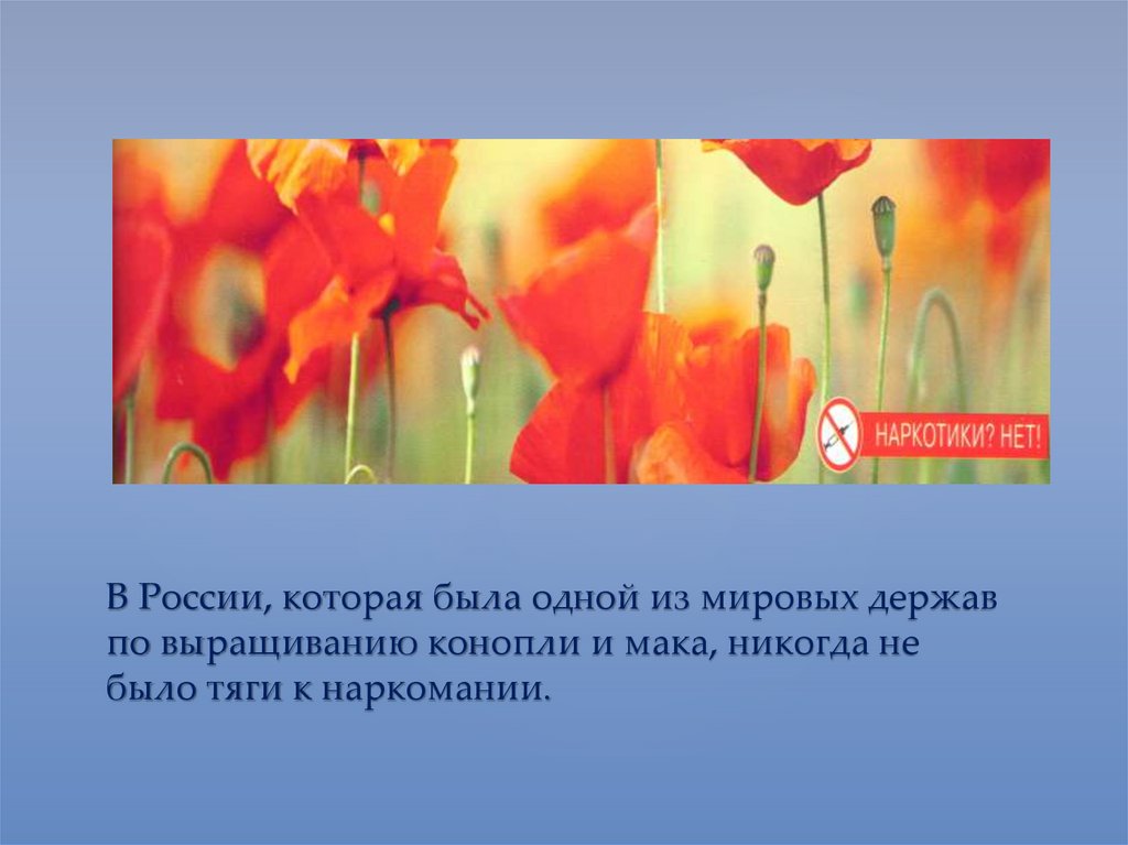 В России, которая была одной из мировых державпо выращиванию конопли и мака, никогда не