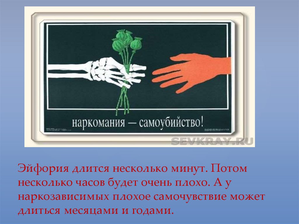 Эйфория длится несколько минут. Потомнесколько часов будет очень плохо. А у