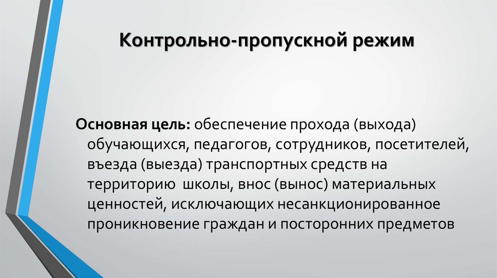 Контрольно-пропускной режимОсновная цель: обеспечение прохода (выхода)
