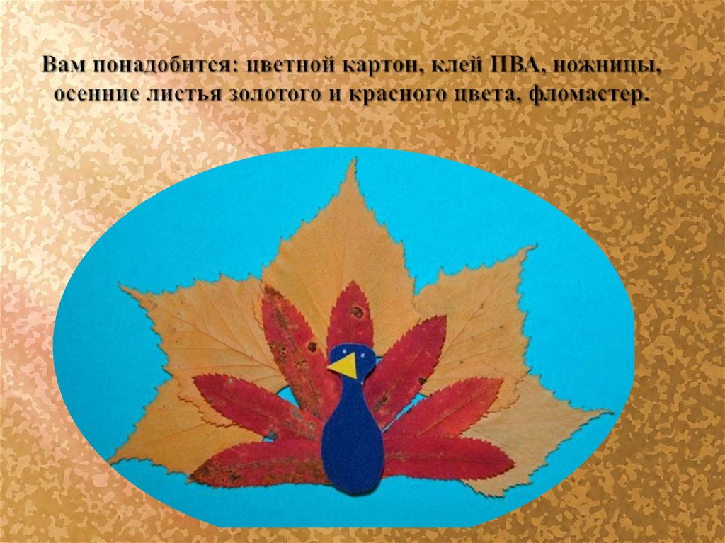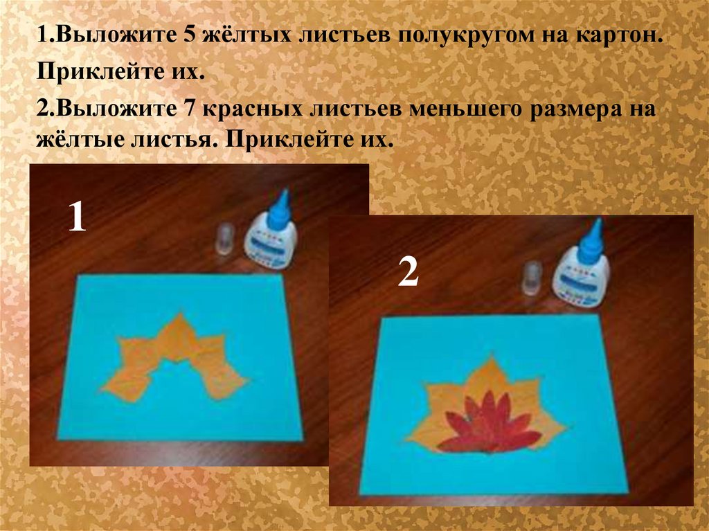 1.Выложите 5 жёлтых листьев полукругом на картон.