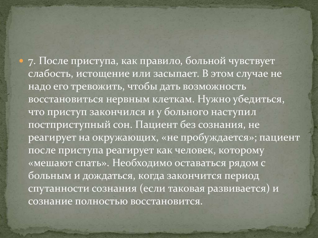7. После приступа, как правило, больной чувствуетслабость, истощение или засыпает. В этом случае не
